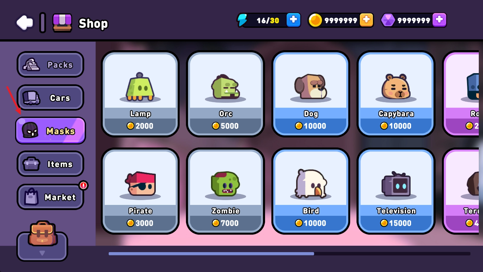 然后找到Masks这一栏,这里有不少皮肤可供购买。