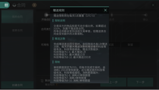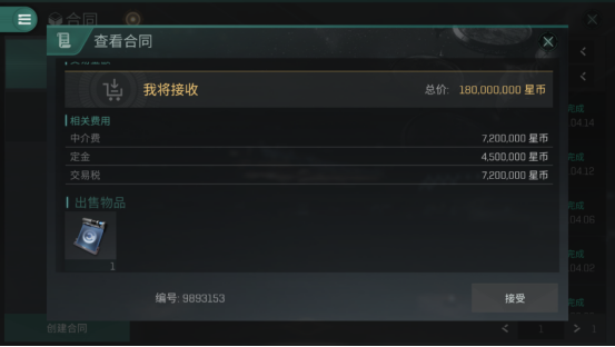 不过合同的情况就不同了,由于不走市场渠道,税率会低不少。中介费和交易税各自都是4%,只是创建合同时得交2.5%的定金,不过整体算下来也就少赚10.5%,这比放到市场上最终要交的23%低多了。而且最重要的是不需要学习任何技能,除非想提高合同数量的上限,那才需要点贸易学(同时也会提升市场订单的上限)。