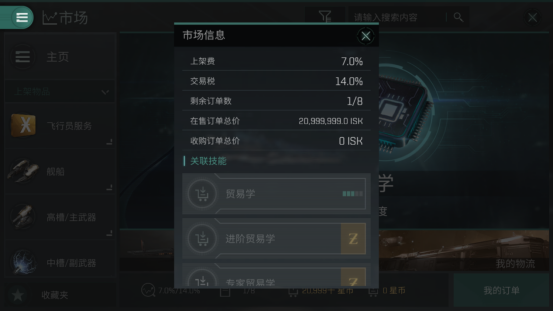 在介绍完游戏里的两种交易方式后,接下来要重点聊聊税率相关的内容。前面提到过,市场交易十分便捷,只要定价合理,低价货物基本能一键卖出,高价货物也不会长时间滞销。毕竟放在市场上的商品,全宇宙各地的玩家都能看到,只要有需求,你就能从中获利。所以市场的基础交易税达到了15%,另外还有8%的上架费(也就是中介费),即便把会计学技能点到满级,也只能减少3%的上架费和5%的交易税。(下图展示的是仅点满了基础会计学技能的情况,所以各自只减免了1%)