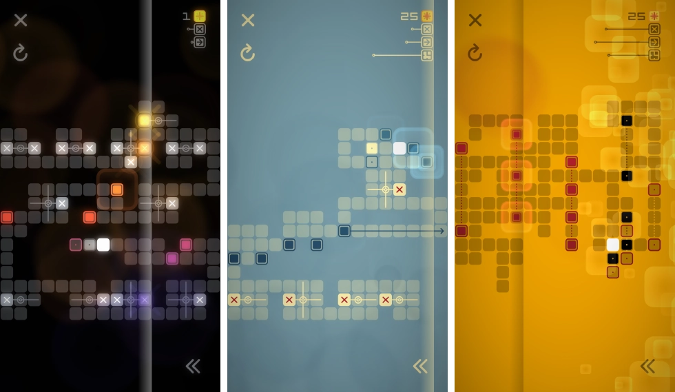 《Resynth》的玩法比较简单,核心规则是玩家要在游戏场景里把所有特殊色块移动到对应的位置,这些位置在场景中会以空心方格的样子呈现。不过,由于这是一款考验智力的游戏,开发者并不想让玩家轻易通关。所以游戏里设计了各种复杂的场景,还设置了一些需要玩家按特定思路才能解锁的小机关。