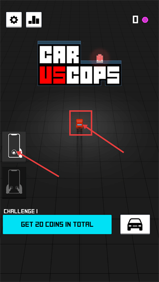 1、选择单指操作模式,驾驶红色汽车,参与【CHALLENGE-1】,目标完成【GET-20-COINS-IN-TOTAL】的收集任务。