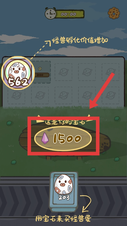 在养成界面中,点击下方的怪兽蛋卡片,消耗对应的宝石进行购买,然后把买到的怪兽蛋放到上方的孵化区域,为孵化培育做准备。