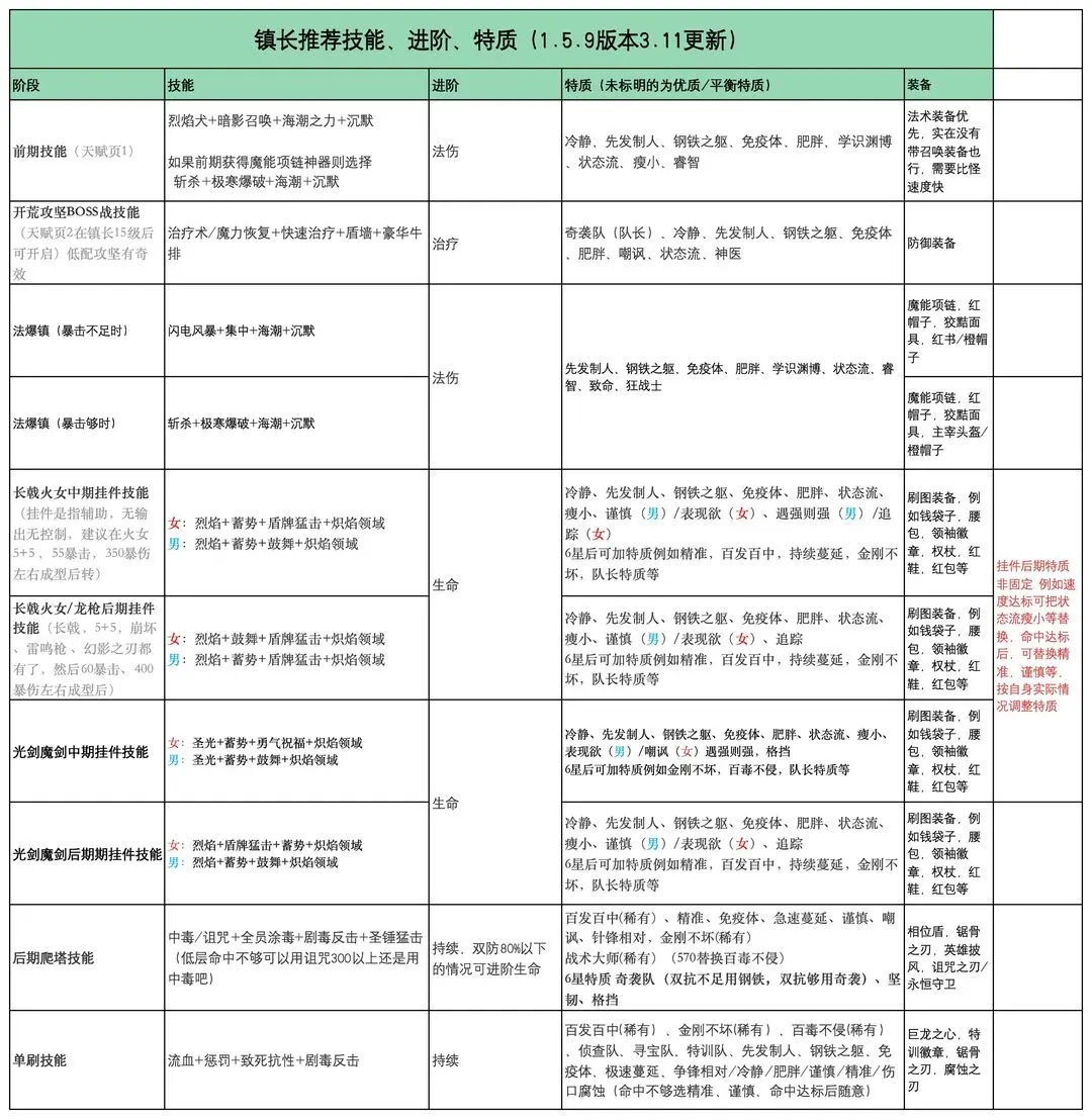 法镇:前期可用于刷图,镇长开局就启动技能,等技能开满后,借助3号和4号群法伤技能来刷图,一回合能释放两个技能(技能释放的详细说明可查看人物页面右上角的绿色问号按钮),朝着法伤方向进阶,装备优先选择法伤类的。(大概用到2000 - 3000周的时候,转型为法爆镇或者挂件镇)