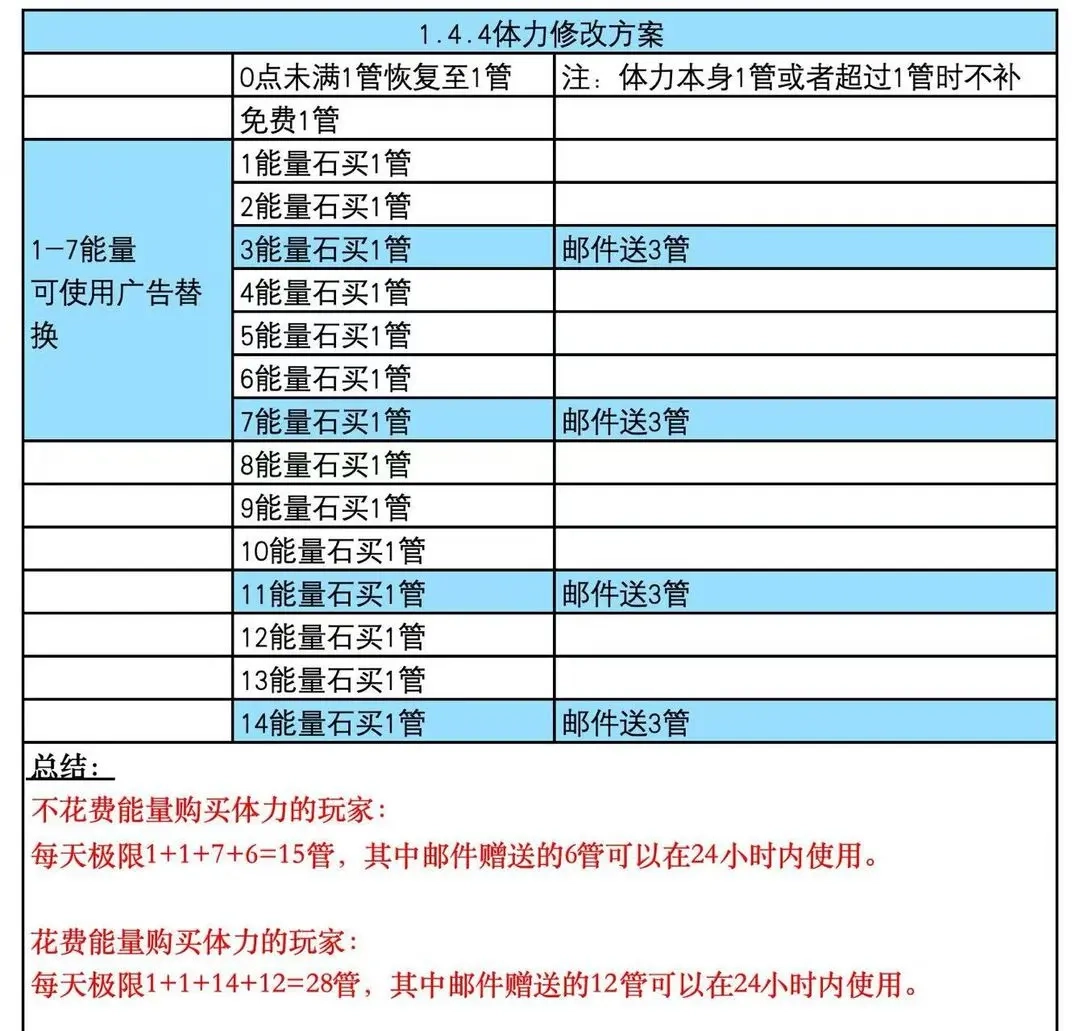 体力方面:进行刷图和遗忘操作各消耗2体力,首次挑战地牢消耗1体力,爬塔消耗5体力。初始的第一管体力是免费的,第1到7管体力可通过观看广告获取,第8到14管体力则需要使用能量石购买。若每天将这些体力全部买完,总共会消耗77能量石,累计可获得280体力。(具体内容可参考本文体力方案的配图)