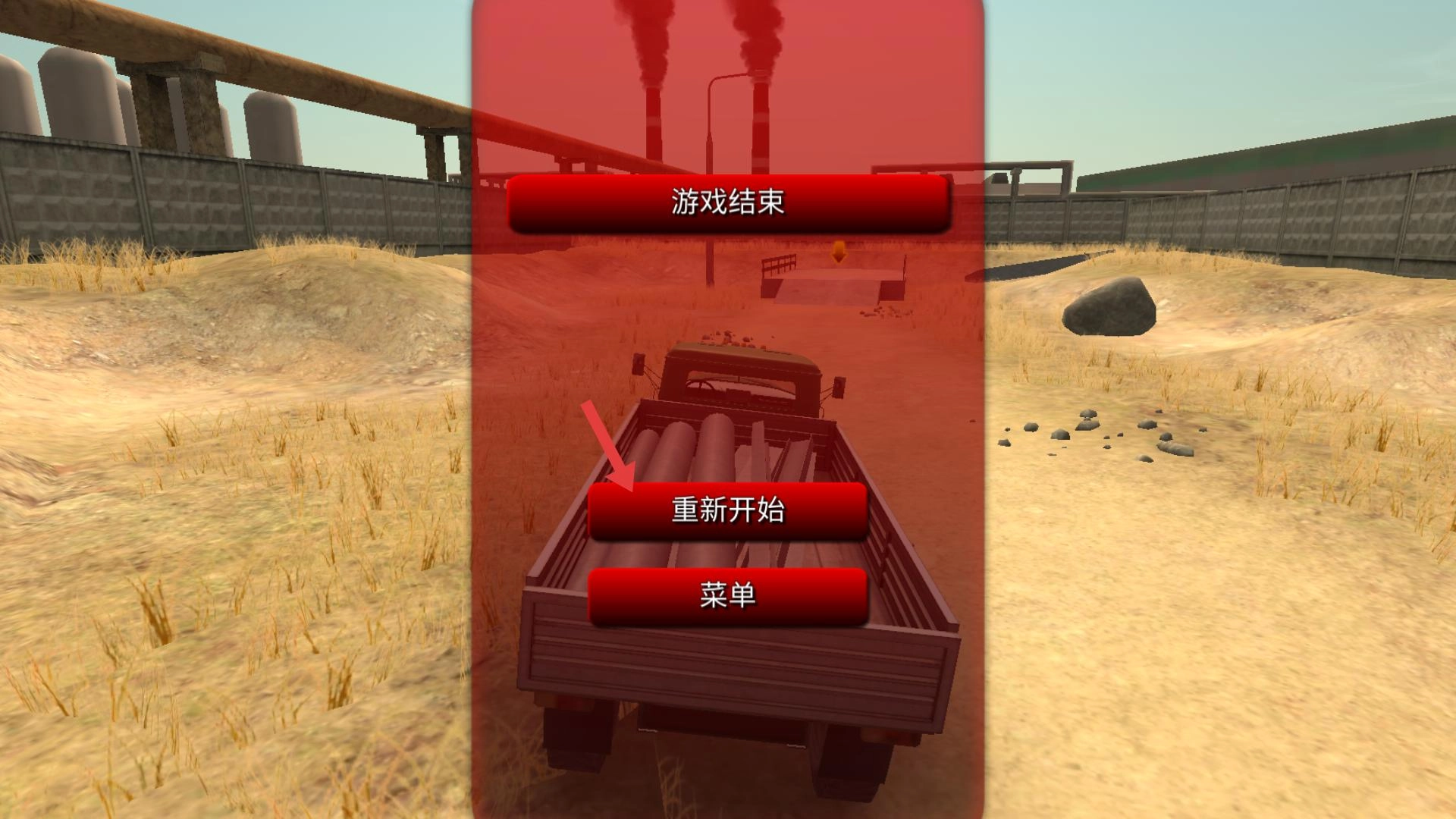 当游戏结束时,界面会呈现【重新开始】与【菜单】两个按钮,点击【重新开始】按钮,就能再次挑战运输任务,持续感受卡车驾驶带来的乐趣。