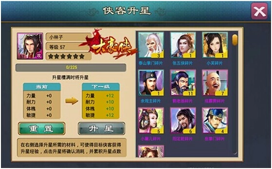 游戏里不同品质的侠客都能升星,星级越高的侠客,带来的属性加成也会更丰厚。升星时,只需消耗同品阶的侠客、同品阶的侠客碎片以及升星丹就行。另外,吞噬同类型的侠客能获取更多经验,而且被吞噬的侠客星级越高,得到的经验就越多。