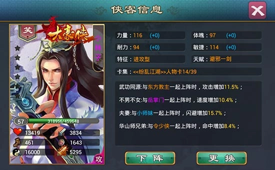 进入游戏后,从主界面点击侠客槽就能看到各类英雄侠客,带你进入英雄最齐全的武侠世界。游戏里每个侠客的养成过程轻松简单,侠客等级提升可直接通过关卡战斗、比武战斗、完成任务获取侠客经验来实现,经验值累积后等级便会提升,同时侠客属性会随着等级提升自然增长,属性值越高,侠客的实力就越强。