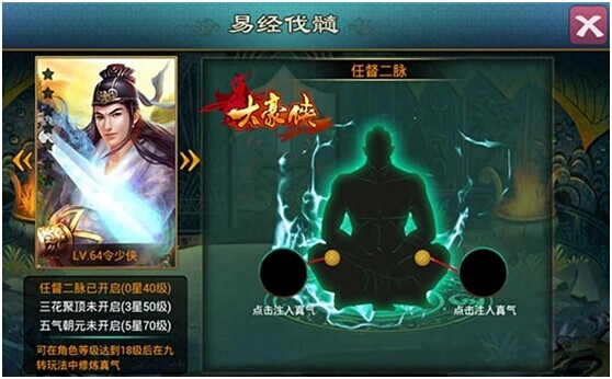 当玩家角色等级达到18级时,将解锁“易筋”玩法。通过在易筋系统中注入真气,能够提升侠客的各项属性。当侠客等级达到40级后,可借助易筋系统注入真气来打通经脉,不同类型的真气会对应增强侠客的不同属性。随着等级的不断提升,玩家还能逐步解锁任督二脉、三花聚顶、五气朝元等更高级的武学,轻松掌握更多强力武功秘籍!