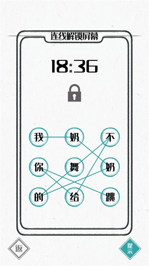 【解锁手机】关卡需通过连线操作解锁屏幕,解锁密码由九个字构成,正确密码是:我奶奶的舞不给你跳,连接该密码就能顺利通关。