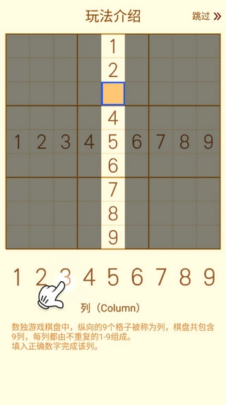 2、在数独游戏的棋盘中,纵向排列的9个格子被称作列,整个棋盘总共有9列,并且每一列都由1到9这九个不重复的数字构成。
