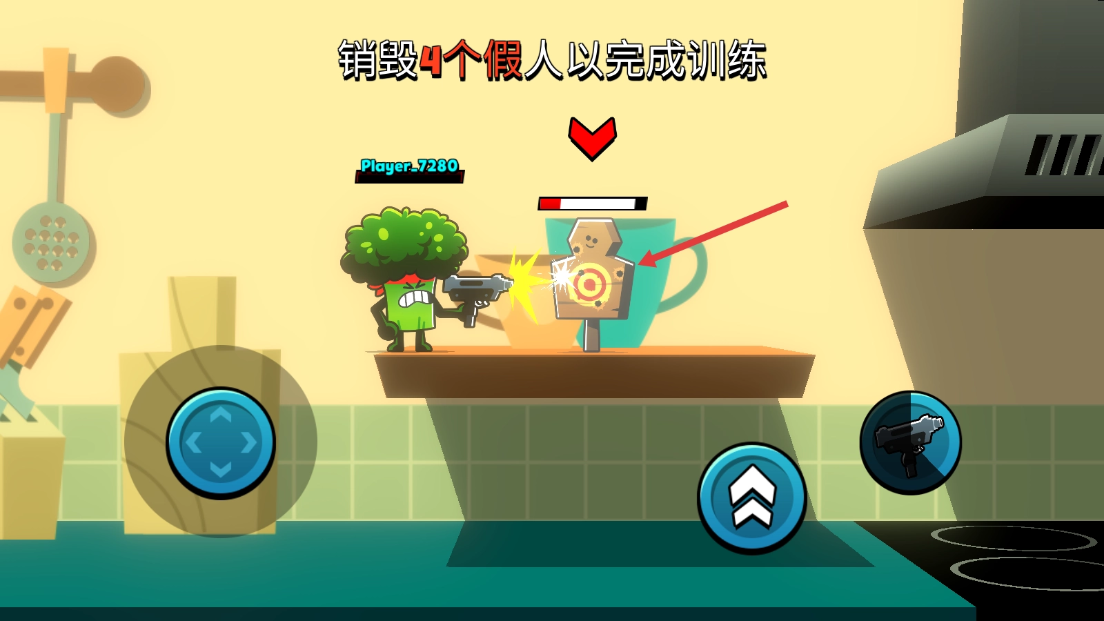 食物帮派是一款非常有趣的动作射击类游戏,卡通的任务形象非常的可爱,这是发生在厨房里的竞技,虚拟的摇杆操控,在游戏中玩家需要操控自己的水果蔬菜进行战斗,你的武器装备可能是枪也可能是斧头。