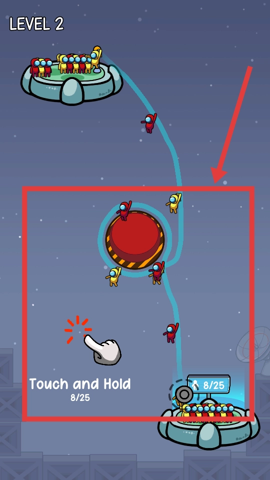 在第二关中会遇到红色圆盘障碍,按照提示长按屏幕来触发消除障碍的操作,这样人群就能沿着绳索继续移动,从而推进关卡进度。