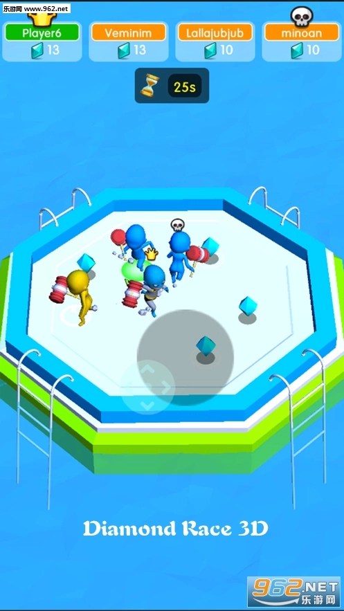 《Diamond Race 3D安卓版》是一款趣味十足的多人io竞技游戏。玩家将被投放到水上擂台,需要在台上移动收集钻石;而擂台周边设有机械拳击手,务必小心躲避其手套攻击——一旦被击中,就会被打飞淘汰。