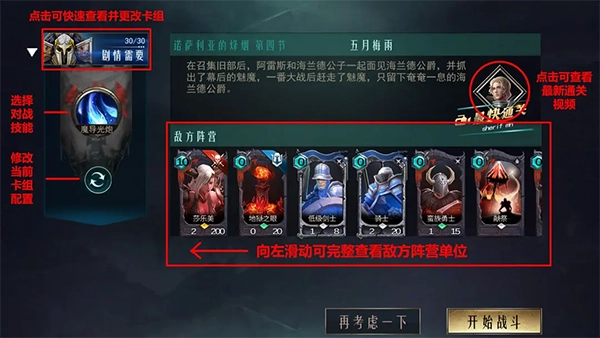 查看敌方阵营的卡牌信息:可逐个点击敌方卡牌,了解其具体属性与技能。此处重点关注Boss以及卡牌右上角带有标签的卡牌就行,其余均为普通卡牌。