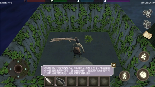 进入游戏后,穿过隧道时我被塌方的巨石困在了这间屋子里,得做一把石斧来劈开巨石才行。眼前有一些材料,靠近它们后点击提示图标就能把物品捡进包裹,滑动屏幕还能切换镜头方向。