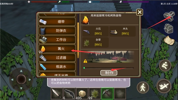 之后收集来的材料就能用来搭建篝火了,这样一来,夜晚时既能驱走寒意,也能将食物烤制成熟。