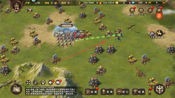 先查看大地图上的资源分布情况,接着点击招募按钮来获取兵力,之后派遣军队去占领各类资源点与据点,以此提升自身的资源储备量和势力覆盖范围。