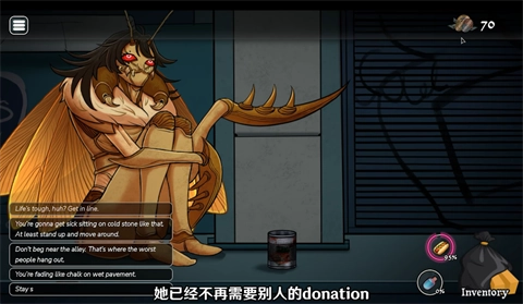 1、扮演的流浪女孩会在午夜星空下的街头盘腿而坐进行乞讨,行人的反应各不相同,增加了游戏的随机性和趣味性。有的行人可能只是匆匆路过,有的会看你一眼,有的可能会扔下硬币。