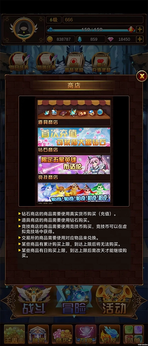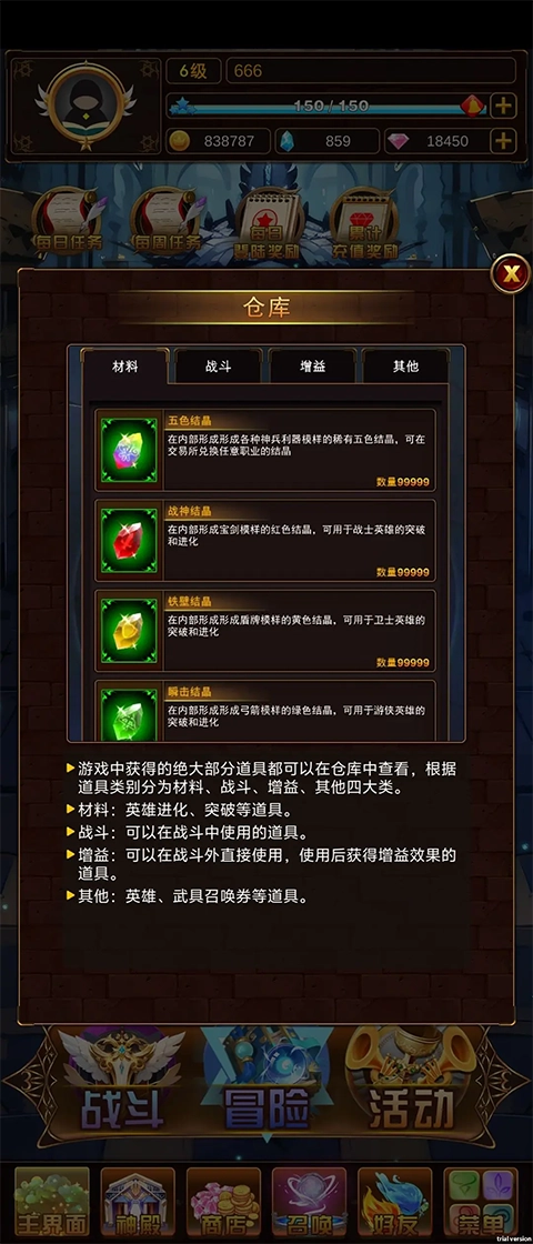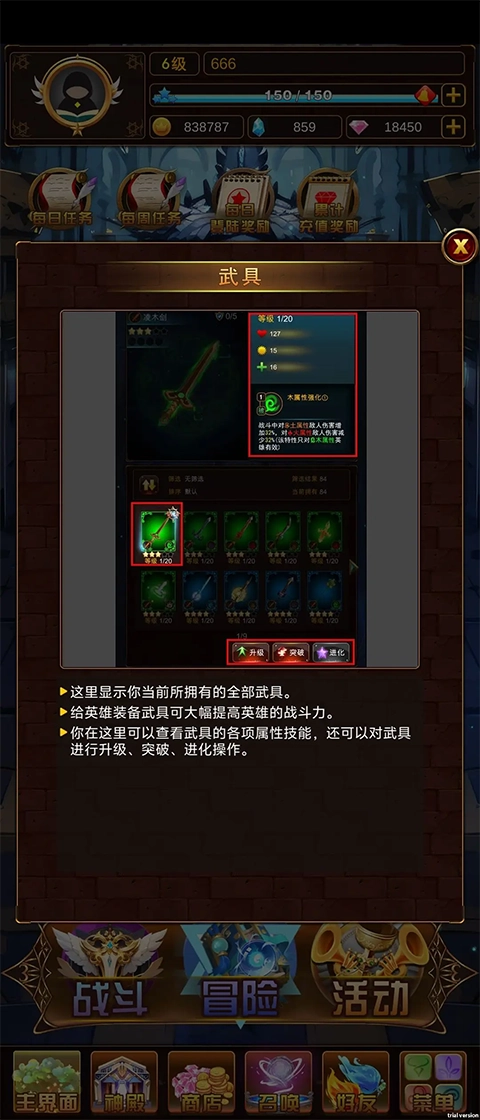 问答英雄的游戏世界包含以下板块:冒险、试炼、竞技、活动等……