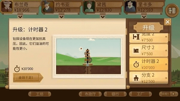 探矿者找到油井后,我们能在它附近放置油井设备,这套设备需要350元。不过事情还没结束,我们得点击设备往下钻井,以此确定更精准的位置。要记住,钻井并非免费,钻得越深,花费就越高。因此刚开始的时候,我们可以分小段距离来钻井,这样能降低不必要的资金消耗。
