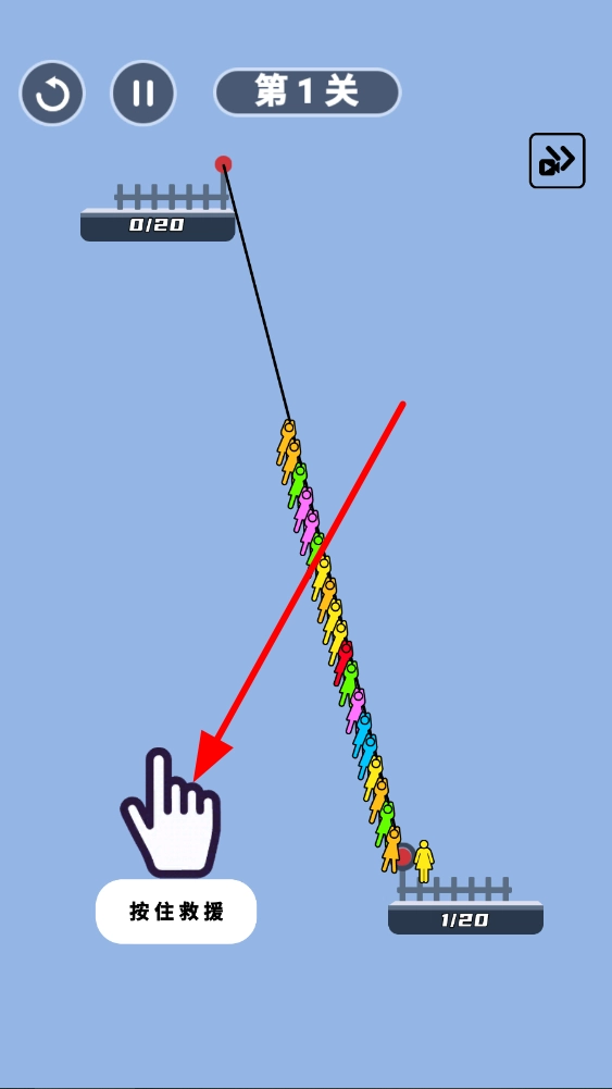 进入关卡后,按照提示操作,通过点击或滑动画线等方式放下绳索,把被困人员所在位置和安全区域连接起来。