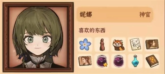 5、妮娜喜爱的物品包括勿忘我、火山女神木雕、唱诗班乐谱集、小熊猫、莫娜肖像、葡萄果酱、吐真剂以及《占卜的起源》。
