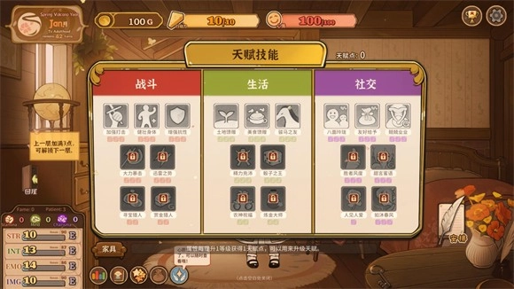 3、社交:社交板块第一行的三个技能建议全部点满。聊天的加成效果最直接,每回合能加2点好感,从夏火年开始算的话,总共能累积10×2×3=60点好感,而且不需要消耗行动力,是很实在的提升方式。送礼的加成则适合针对特定角色定点高效刷好感,主要用来前期找探险搭档,或者后期好感不够时快速补分。小费的加成配合七八月份的浴场翻倍活动,能快速刷钱。第二行优先点满甜言蜜语,打折天赋除了刷肥料外用处不算突出,但可以结合三四月份的打折期,倒卖之前入手的武器,再配合领主任务,能完成一波原始资本积累。第三行可根据自身情况选择,推荐点人见人爱,能加快好感提升速度。