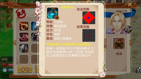 李牧的调兵遣将技能十分实用:它能帮你化解走位失误,让走错位置的将士重新调整站位;也能号令麾下向前冲锋;最关键的是,这项技能无需消耗回合就能完成移位,让你更灵活地排兵布阵。他真是位出色的统帅!
