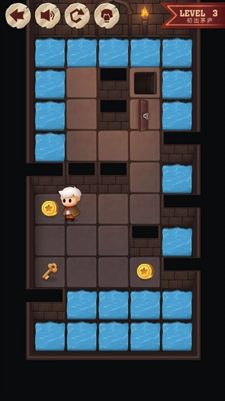 玩家滑动屏幕,就能操控角色朝着相同方向移动;想要通关的话,需要收集三个金币和一把钥匙。