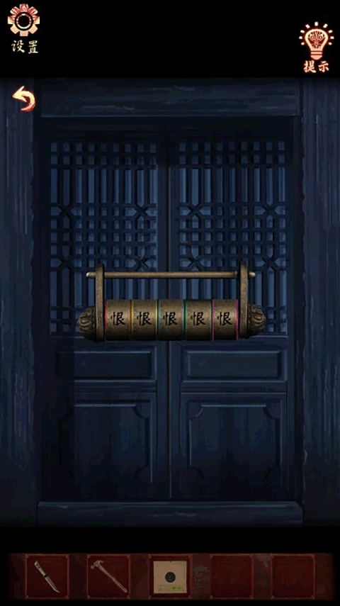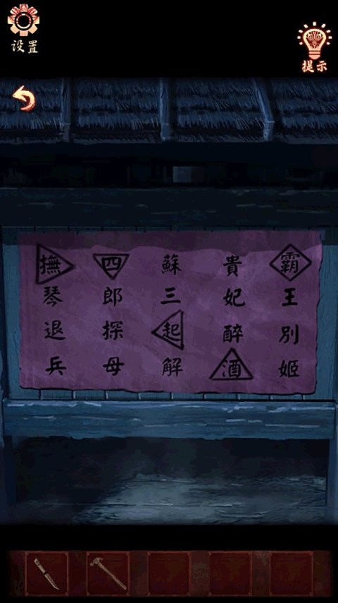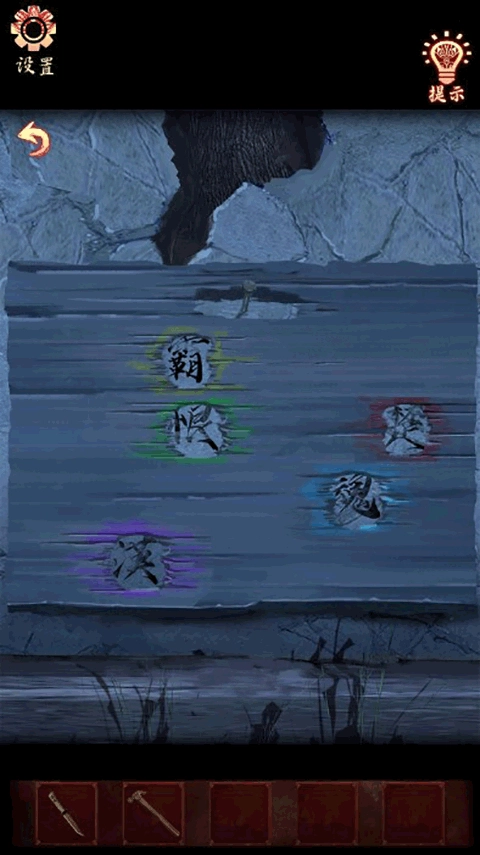 点击墙上的文字,放置【带孔木板】,即可获取线索:霸对应黄色、恨对应绿色、楚对应红色、魂对应蓝色、漢对应绿色。