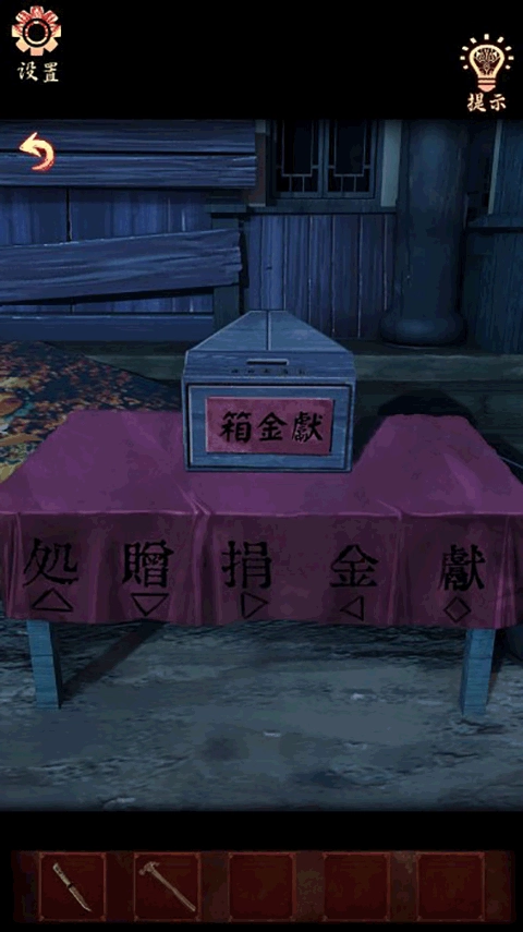 点击桌上的捐赠箱,按照桌布上正三角形、倒三角形、右三角形、左三角形、菱形的图案顺序,再对照告示牌上右三角形对应“抚”、倒三角形对应“四”、左三角形对应“起”、正三角形对应“酒”、菱形对应“霸”的线索,把密码锁调整为“酒四抚起霸”。