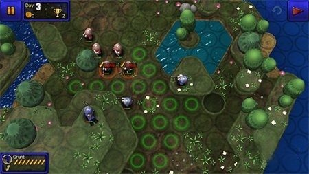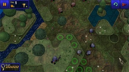 这是第二个防守关卡,玩家需要在上面部署2个狙击手和2-3个火箭炮进行防守;而在下面则部署2部自走炮和1部坦克进行防御,需要注意的是自走炮的弹药问题:可以到回复池进行弹药补给以确保持续作战能力。