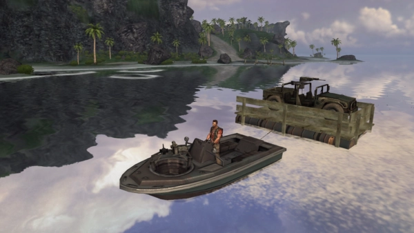 驾着冲锋舟抵达西边的岛群,远远便能望见山顶的通信雷达,岸边还有士兵四处巡逻——看来这帮武装分子是铁了心要在这片大好河山里长期盘踞了……首先得把岛外的几个守卫解决掉,接着就能驾驶武装小艇往岛内冲;快接近时用艇上的机枪扫射,火力绝对够猛!在小棚子里能找到一把狙击枪,想必这可是不少玩家的心头好!沿着山路往山顶摸去,沿途自然会不断和巡逻士兵爆发激烈枪战,之后搭乘升降电梯登上山顶;山顶的敌人不少,得留意他们扔的手雷,把平台上的残敌清理干净后,堡垒那扇大门暂时打不开,得等神秘人物破译密码。这时候千万别去平台,榴弹炮会轰过来,小心被炸得粉身碎骨!天上敌人的运输机会空投增援,还有两架直升机会朝你扫射,能不能保住性命,就看你自己的本事了……终于身后的大门打开了,进去解决通信士官,拿到钥匙取来炸药,再到最里面的屋子安放好——10,9,8,7……轰!整个堡垒在剧烈的爆炸声中彻底化为废墟……