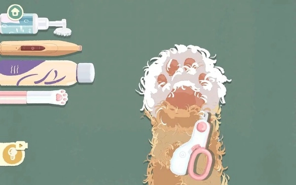 给粉粉的肉垫做护理时,要先修剪指甲(注意有5个指甲哦!!),接着剃毛,然后用蓝色喷刷,最后用紫色的产品。