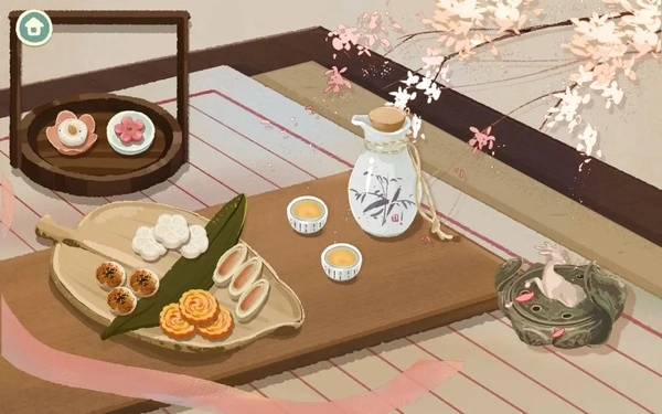 如意糕(购买后记得点击茶壶倒茶,接着找到可移动的花瓣,将其拖至后方,让后面两块糕点变色)