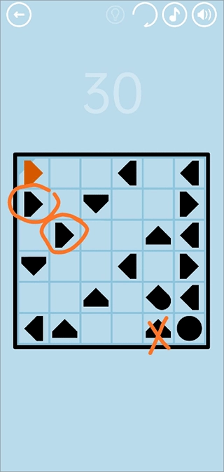 第三十关的规则是箭头指向的目标会被夺舍,通关的关键在于让左侧的两个右箭头与黑球发生接触。