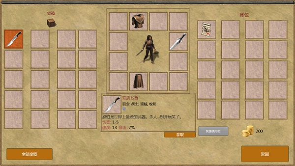 可以查看自身装备、背包以及箱子内的各类物品,点击即可获取。