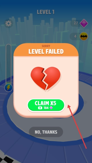 战斗失利后,在LEVEL FAILED界面可以选择点击CLAIMX5观看广告复活,也可以选择点击NO, THANKS重新开始本关卡。
