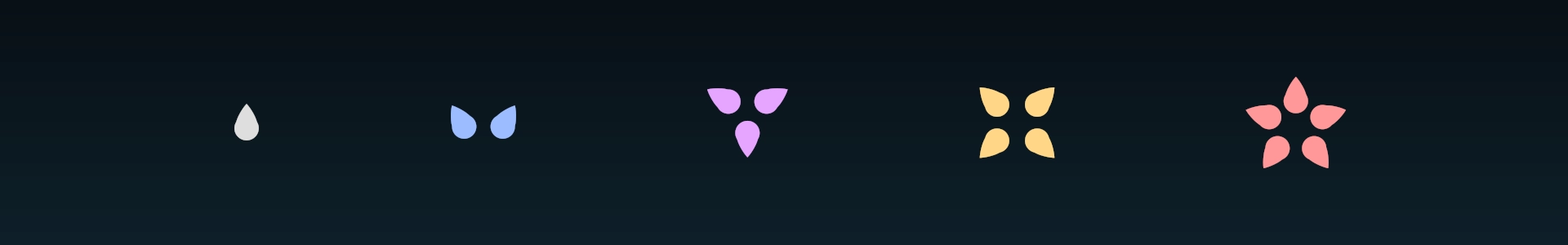 您可以在局内和局外的装备卡片,以及落物堆的光柱上看到如下品级图标,花瓣数量越多,就意味着该装备的品级越高。