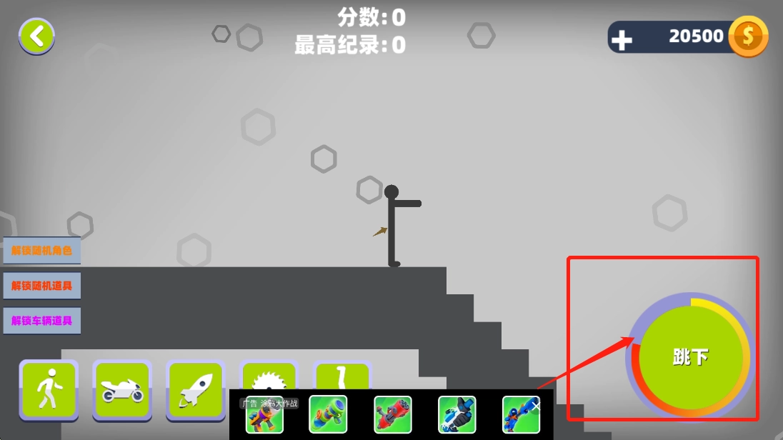 火柴人的粉碎程度越高,得分就越高。利用各类道具能够获取更高分数。竹蜻蜓能让火柴人在空中飞行一会儿,吸金石则可以自动收集周边的钥匙和金币。