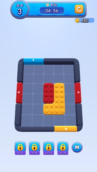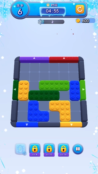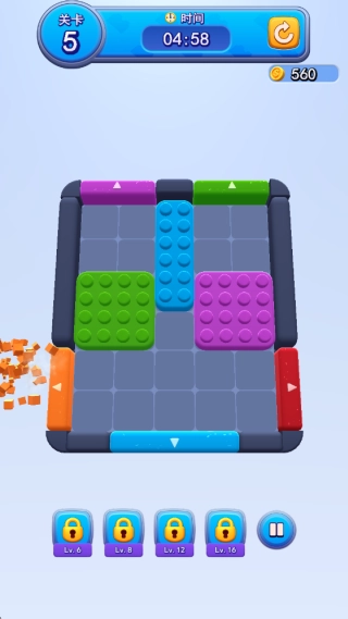 3、后续关卡中方块的颜色种类会更加复杂,你需要继续规划移动路径来消除,并注意带有右箭头的方块是固定无法移动的障碍。