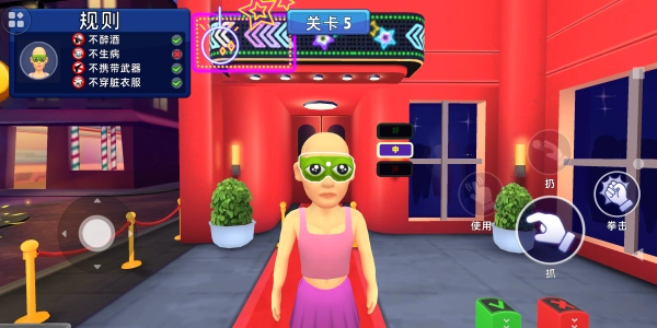 2.玩家需要根据画面左上方的规则提示来进行判断是否放行客人。放行则使用绿色的道具,不放行则使用红色的道具。