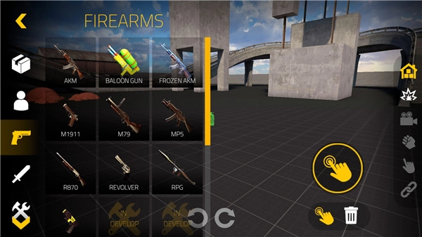2、进入沙盒世界后,可借助左右两侧的虚拟按键,操控人物完成移动、跳跃、蹲下、射击等动作;