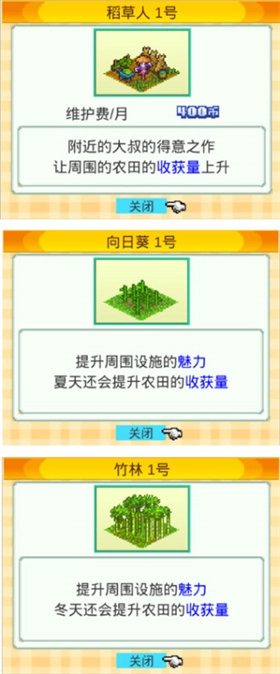 除了道具之外,搭建合适的环境设施同样能够增加作物的产量。稻草人在提升产量方面效果就很显著。另外,部分环境设施会依据季节来给产量提供加成,像竹林能提高冬季的收成、向日葵能提高夏季的收成之类的。