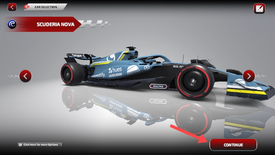 2、进入【CARSELECTION】界面后,借助左右箭头挑选赛车(例如【SCUDERIANOVA】),选定后点击【CONTINUE】按钮。