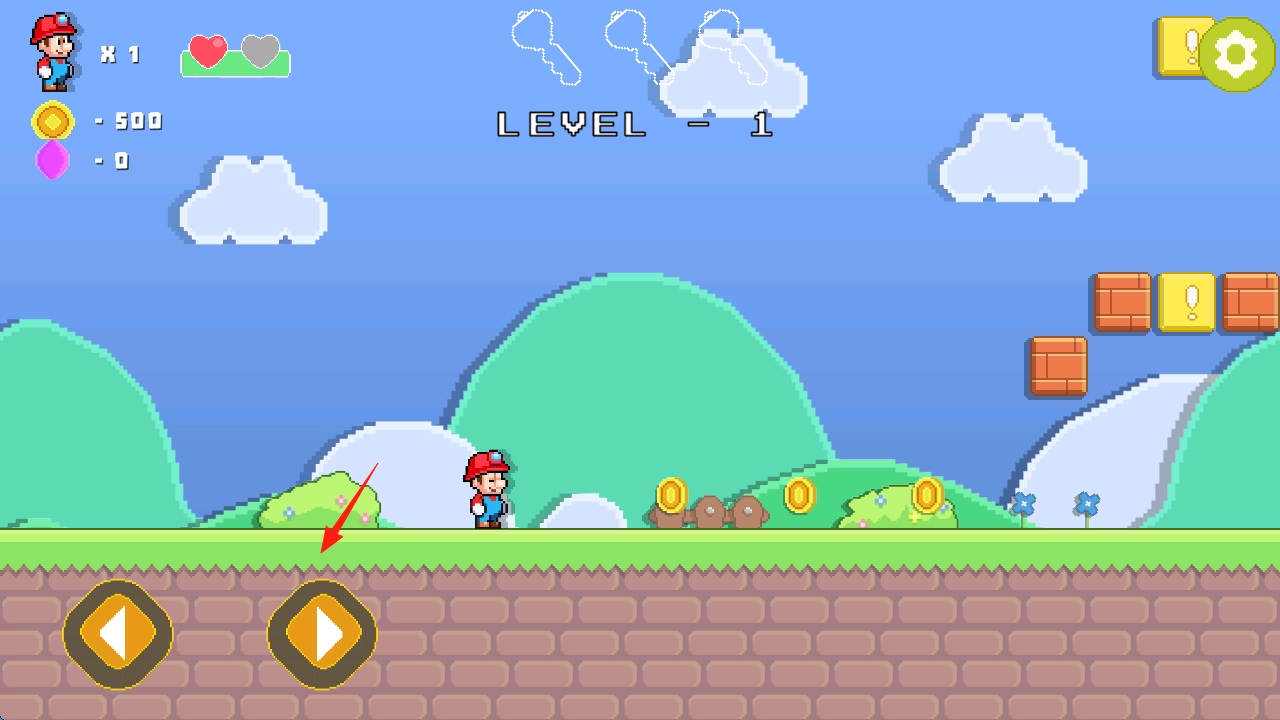 3、靠近砖块区域(红箭头指示处),长按跳跃键,顶破问号砖块,领取奖励(爱心与金币),越过障碍,继续推进关卡进度。