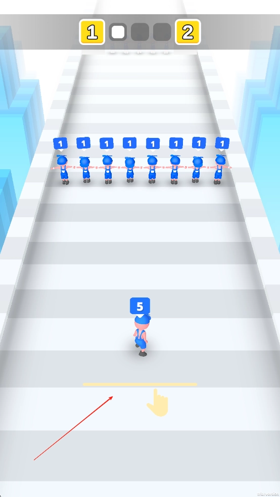 2、操控队伍向前冲刺,遇到人墙时判断对方头顶数字,选择比自身数字小的人墙撞击,撞击成功后数字叠加,遇到更大数字需绕行或召唤更多伙伴。