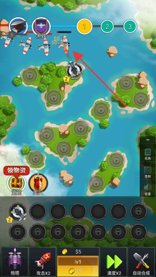 1、点击下方带标识的空位,选择【炮塔】等防御建筑,部署到岛屿,构建防御基础。