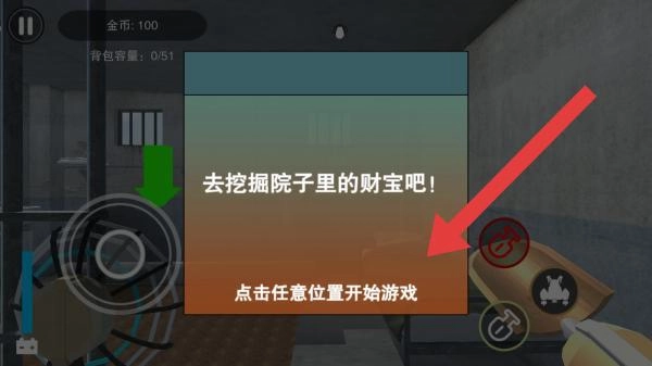 2、按照文字提示“去挖掘院子里的财宝吧!”,玩家需执行相应操作,点击任意位置就能启动。