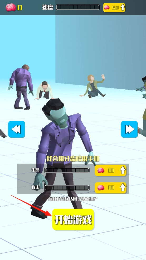 1、指挥紫色僵尸袭击路人以夺取大脑,每成功咬到一个目标就能累积经验值;生命与攻击这两项属性,都可以消耗100个大脑进行升级;速度条将影响你的移动频次,要记住优先强化攻击力,这样才能更迅速地战胜对手。